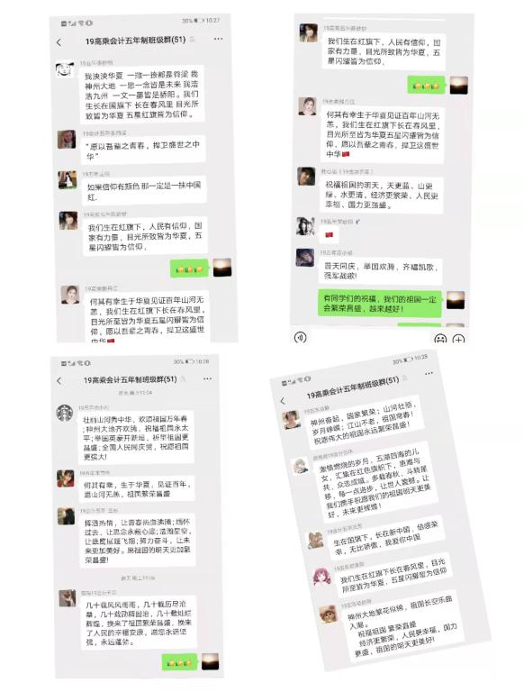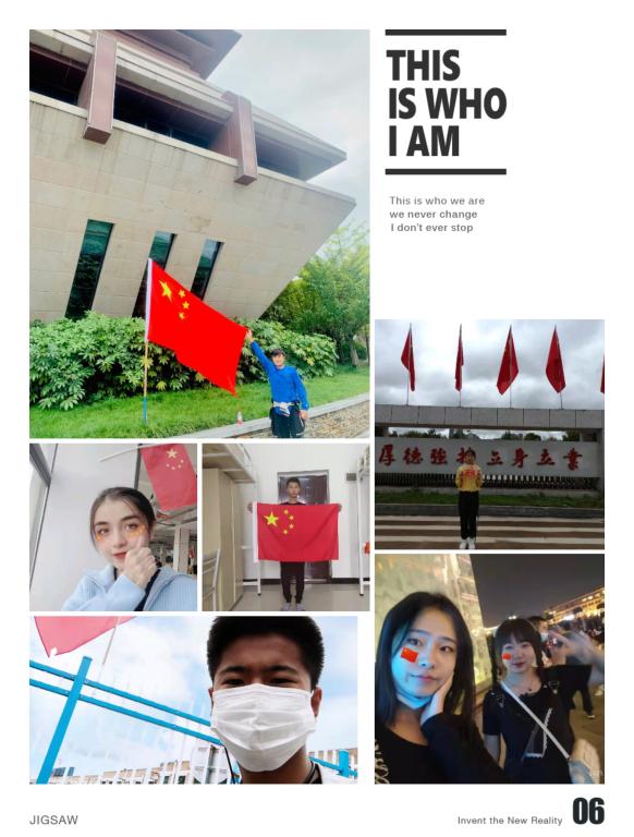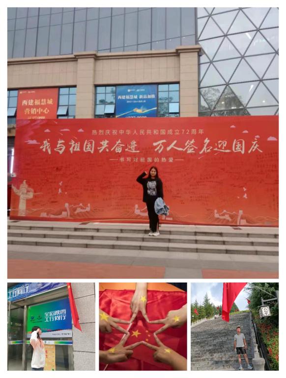 同学们怀着激动的心情在不同场合与鲜艳的五星红旗合影留念。有的同学将小小的国旗贴在脸上,有的同学面对国旗庄严敬礼,有的同学用国旗装扮了宿舍等等,这一个个举动都表达了新时代老员工对祖国的热爱之情。