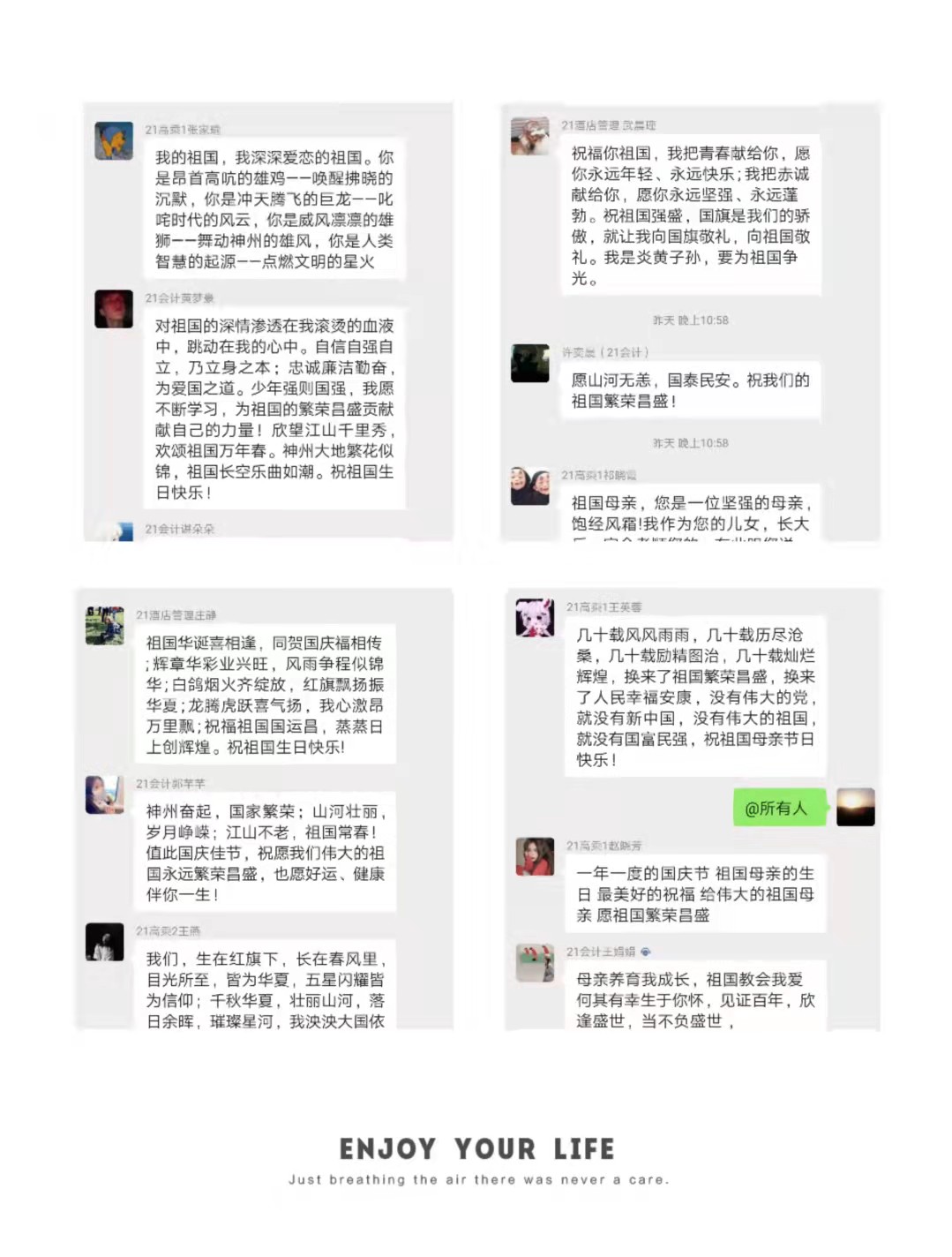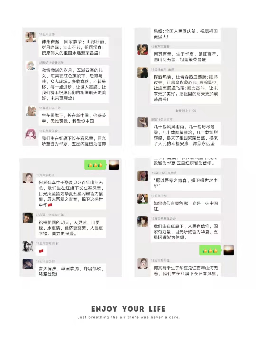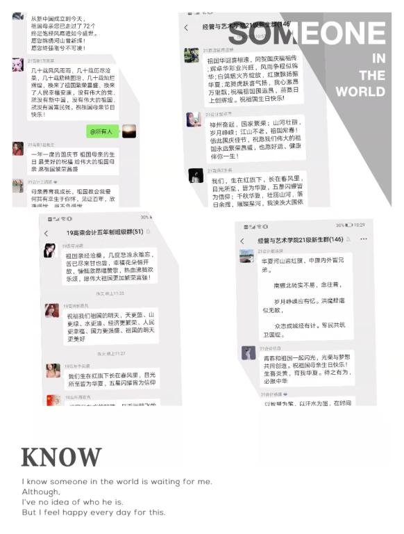 同时,同学们还发自内心的将“祖国母亲,生日快乐!”“我爱你,中国!”“我骄傲,我是中国人!”“祝您繁荣富强,越来越好!”“愿祖国母亲明天更好!”“愿以吾辈之青春,捍卫盛世之中华。愿山河无恙,祝祖国繁荣昌盛!”等一句句发自肺腑的祝福语献给了我们伟大的祖国。