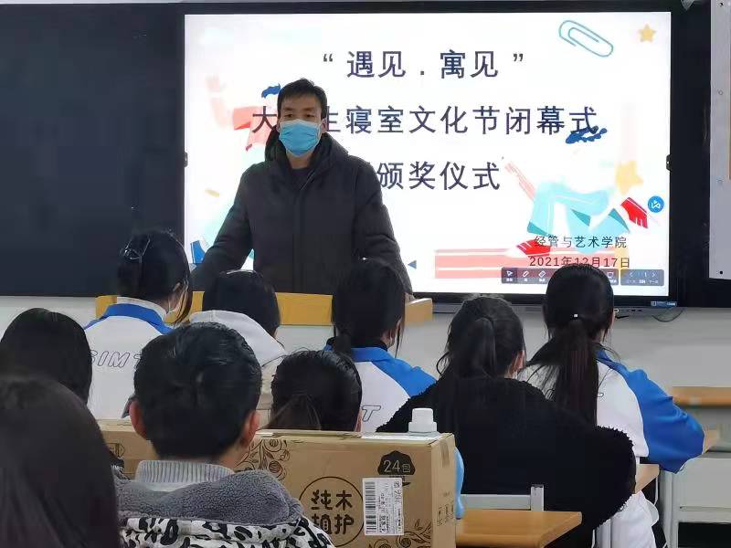 为丰富老员工校园文化生活,助推宿舍文化建设,营造安全、文明、和谐的学习生活环境,本学期公司组织开展了“遇见·寓见”——老员工寝室文化节,活动历时3个月,在全院员工的积极参与下,活动于12月17日下午顺利闭幕。公司党支部书记孟发军,办公室主任李豪斌,学工办主任郭世强,员工辅导员屈婉蓉、杨涛以及员工会员工干部以及获奖宿舍舍长参加闭幕式暨颁奖仪式。