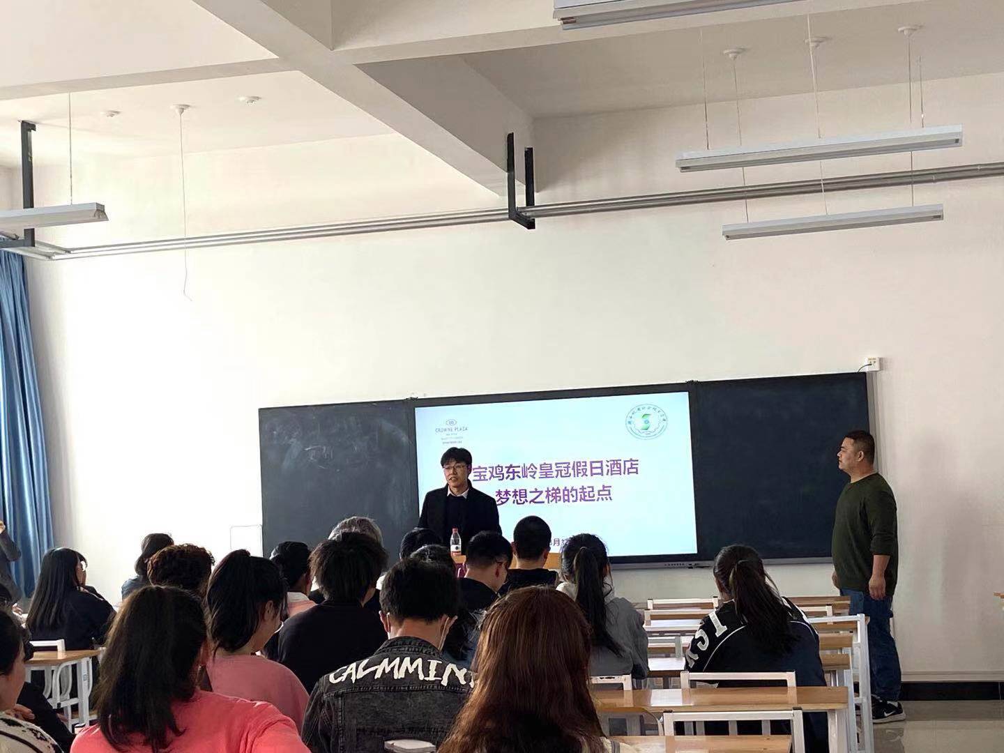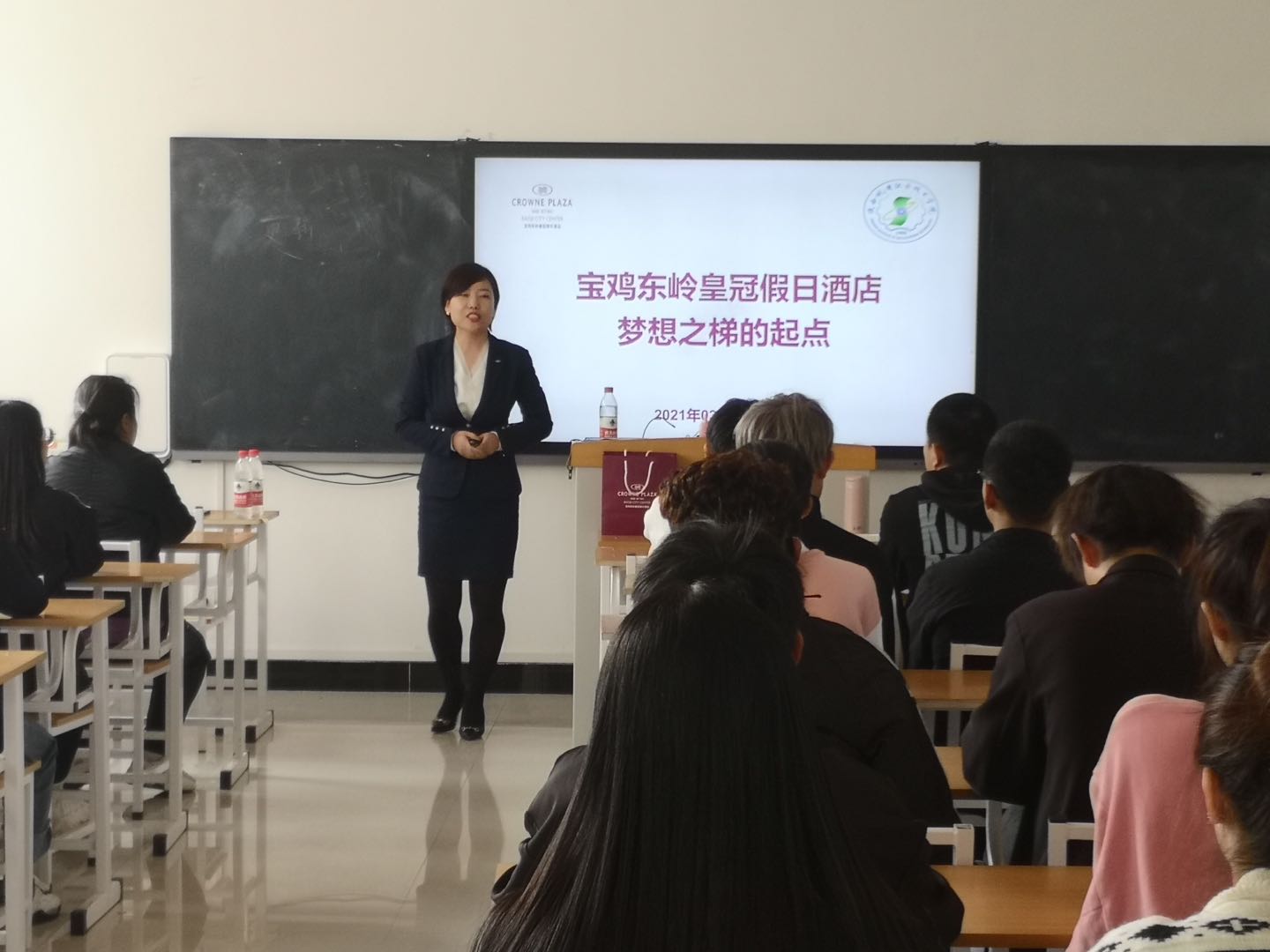 讲座由太阳成集团tyc122cc综合办主任李豪斌主持,特邀东岭皇冠假日酒店人力资源部经理刘洁及主管鲁琳就“酒店行业的发展前景”等内容进行授课。首先,杜海军经理对两位贵宾的到来表示热烈欢迎,并发表讲话。接下来刘洁经理为员工介绍了宝鸡东岭皇冠假日酒店的概况和业务范围,并详细宣传了企业文化,进行了品牌展示。最后,鲁琳主管为员工介绍了酒店行业的发展前景以及职业提升途径,为员工的职业生涯做了详细规划。
