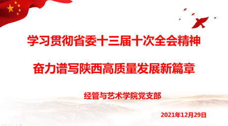 12月29日16:00,经管与艺术公司党支部全体党员在线上参加支部会议,集中学习《中共陕西省委十三届十次全会精神》。