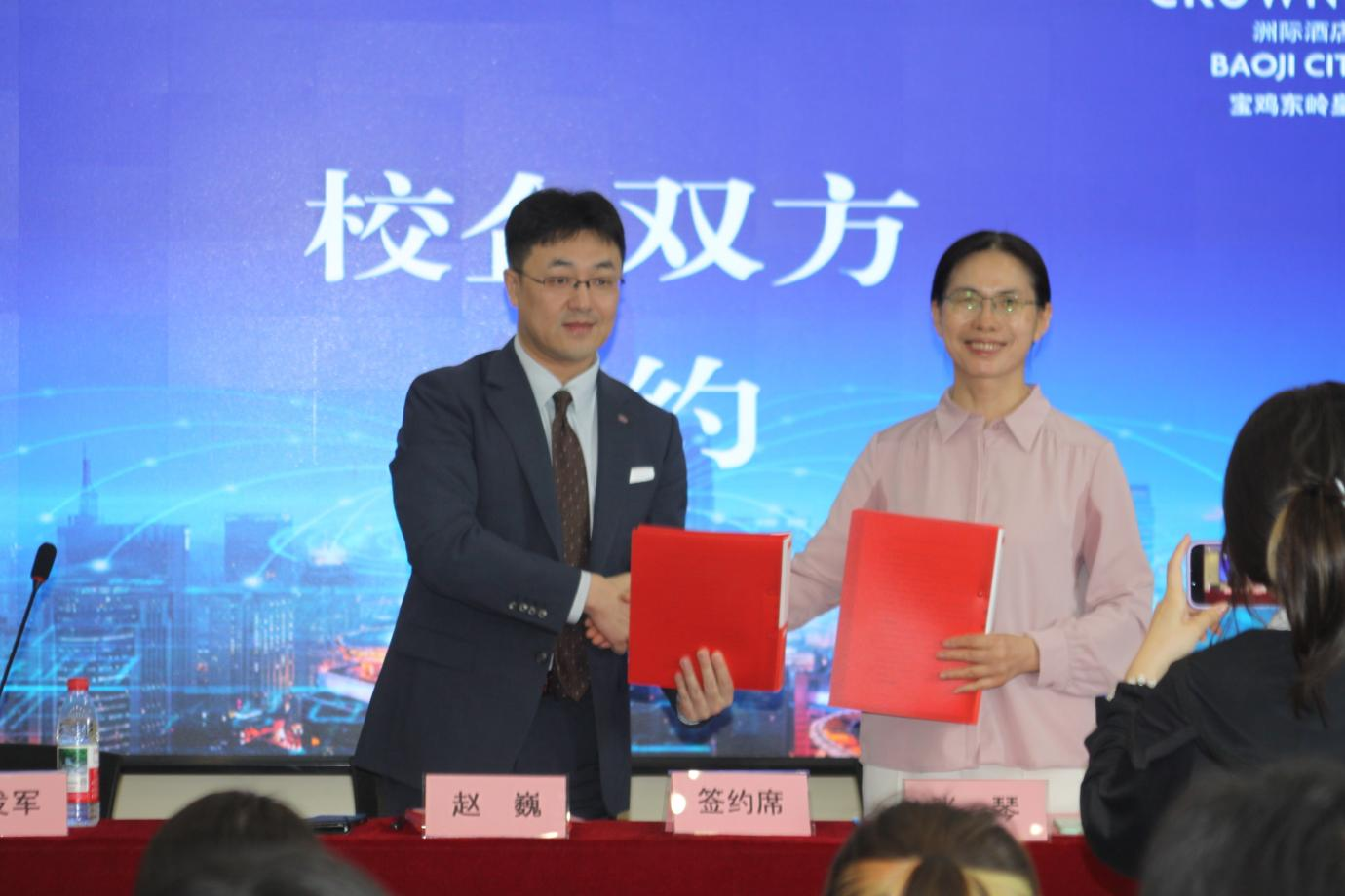 接着,张琴和赵巍为太阳成集团tyc在宝鸡东岭皇冠假日酒店的“就业实习基地”和宝鸡东岭皇冠假日酒店在太阳成集团tyc的“人才培养基地”揭牌,并进行校企合作签约仪式。