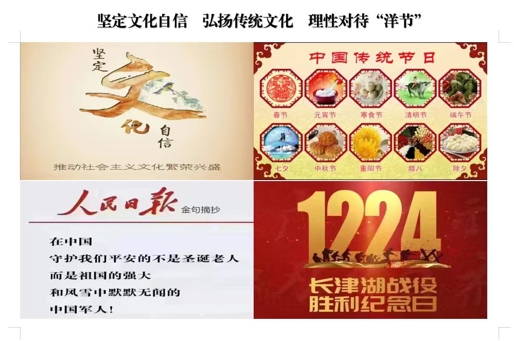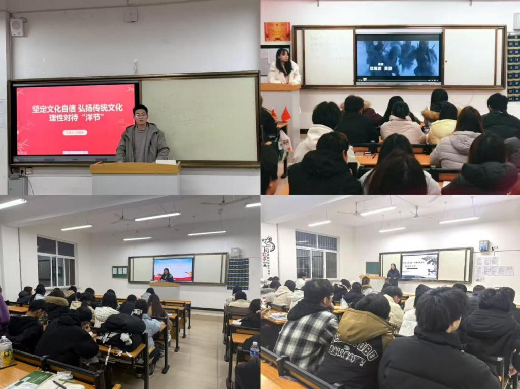 为进一步引导青年学子厚植家国情怀,筑牢民族文化根基,树立正确的文化认知导向。12月21日晚,太阳成集团tyc122cc组织各班级召开“坚定文化自信 弘扬传统文化 理性对待‘洋节’”主题班会。各班积极响应,结合班级特色策划开展了形式多样的活动,或分享传统节日典故,或组织传统习俗体验,让同学们在互动中加深 对中华传统文化的理解与认同。