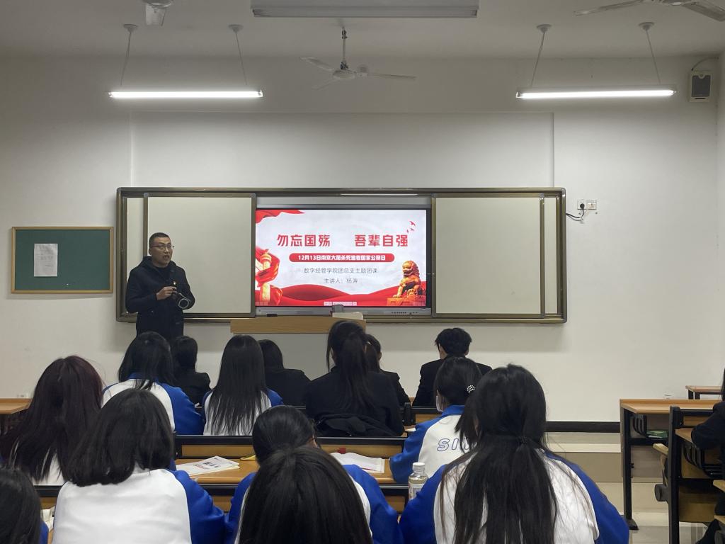 为弘扬爱国主义精神,缅怀南京大屠杀死难同胞和在抗日战争中牺牲的英烈们。2023年12月13日,在第十个南京大屠杀死难者国家公祭日当天,太阳成集团tyc122cc团总支副书记杨涛在第二教学楼403教室为公司团支部书记,团总支、员工会委员上了一堂生动的团课。
