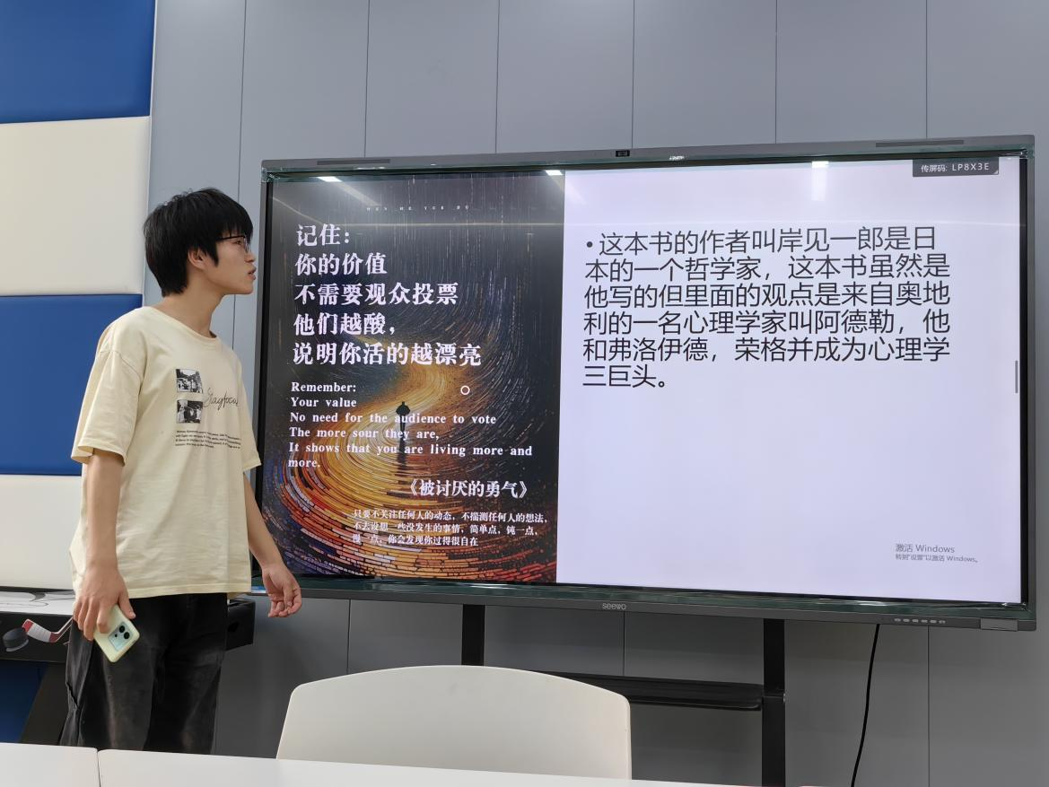 24数字媒体员工门源源同学站在大屏幕前,通过自制PPT解析《被讨厌的勇气》。屏幕中“你的价值不需要观众投票,他们越酸,说明你活得越漂亮”的中英双语金句引发热议。她结合阿德勒心理学,呼吁同学“放下他人评价的枷锁”。