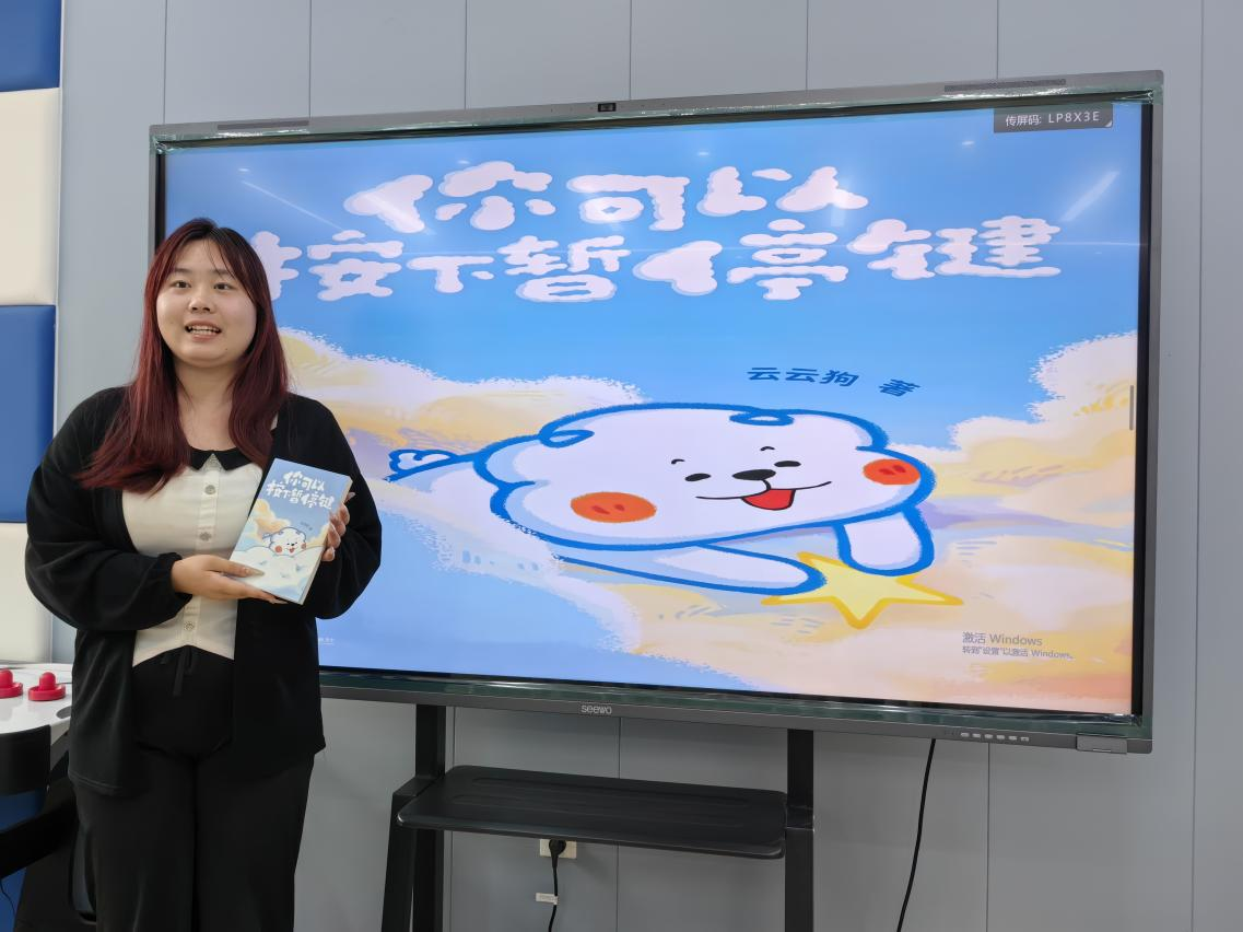 24动漫制作班心理委员杜丽媛同学,手持《你可以按下暂停键》,身后屏幕同步展示书籍封面与云朵小狗插画。她以“焦虑时如何自我暂停”为话题,演示呼吸调节法:“就像书里的小狗,吐舌头不是摆烂,而是给自己一个深呼吸的间隙。”