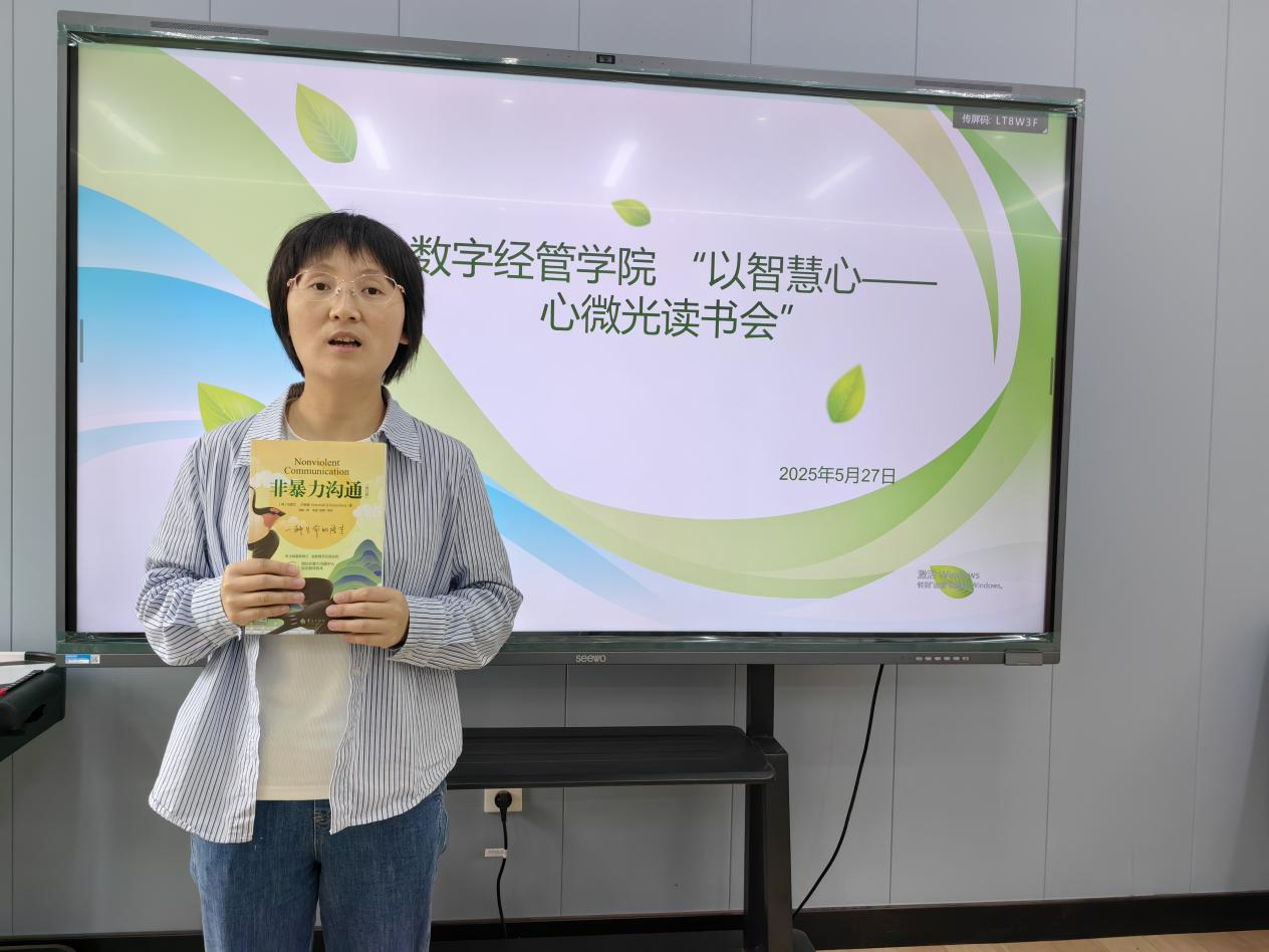 专职辅导员何睦老师为全体员工们分享《非暴力沟通》一书,书籍封面与“观察-感受-需求”沟通模型清晰可见。“书中‘不带评论的观察’让我反思,原来我们总是用批判代替理解,这种阅读像一面镜子,照见自己的沟通盲区。”
