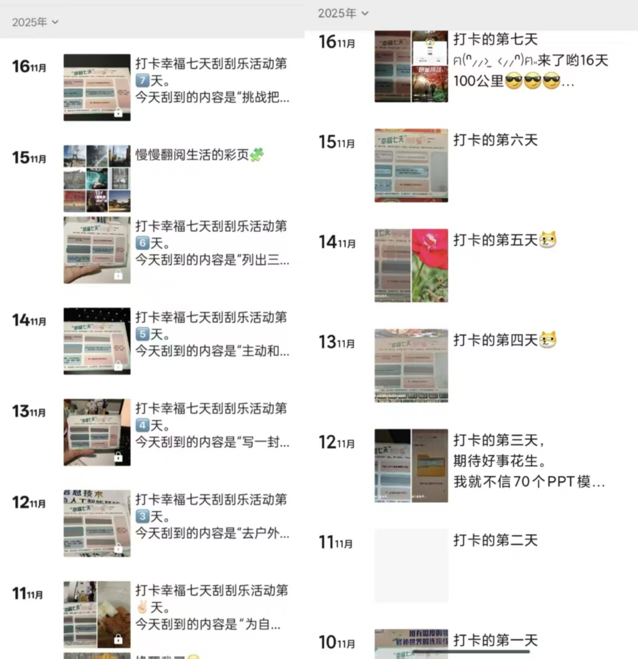 为培养员工积极心态,提升主观幸福感,公司在11月开展了“幸福七天刮刮乐”活动通过连续七天完成一个简单、正向的小任务,引导参与者关注生活中的美好瞬间,有意识地去发现、记录和创造幸福,从而对抗日常的麻木与压力,提升整体的幸福感知力。