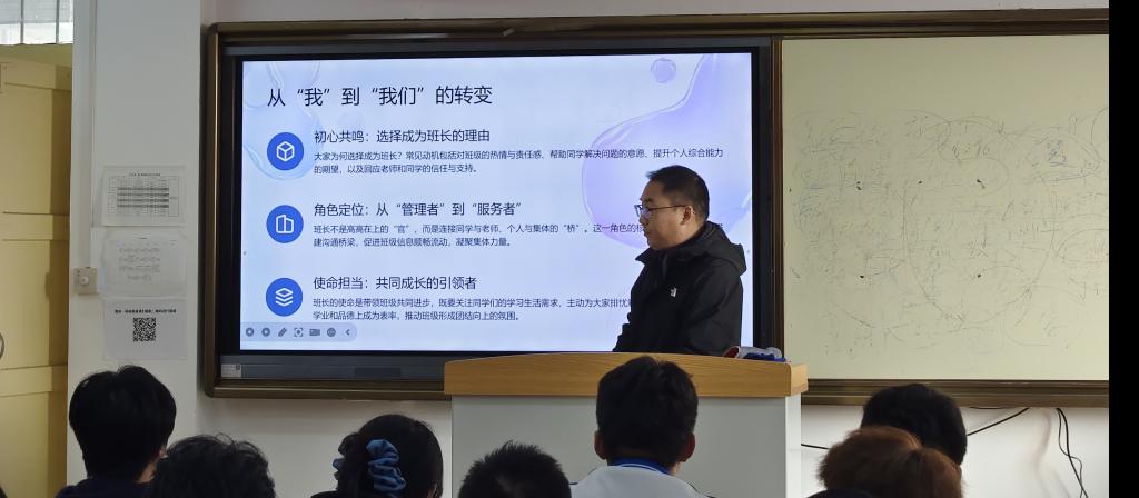 11月11日下午,针对各班班长的培训如期举行。曹朋伟老师以“员工干部责任和服务意识、履职能力”为核心主题,通过案例分析、情景模拟等方式,深入阐释了班长作为班级“领头雁”的重要职责。他强调,班长既要具备强烈的责任担当,也要有高效的沟通协调能力和服务意识,要时刻心系同学、以身作则,在班级管理中做到公平公正、务实尽责,带领班级营造良好的班风学风。