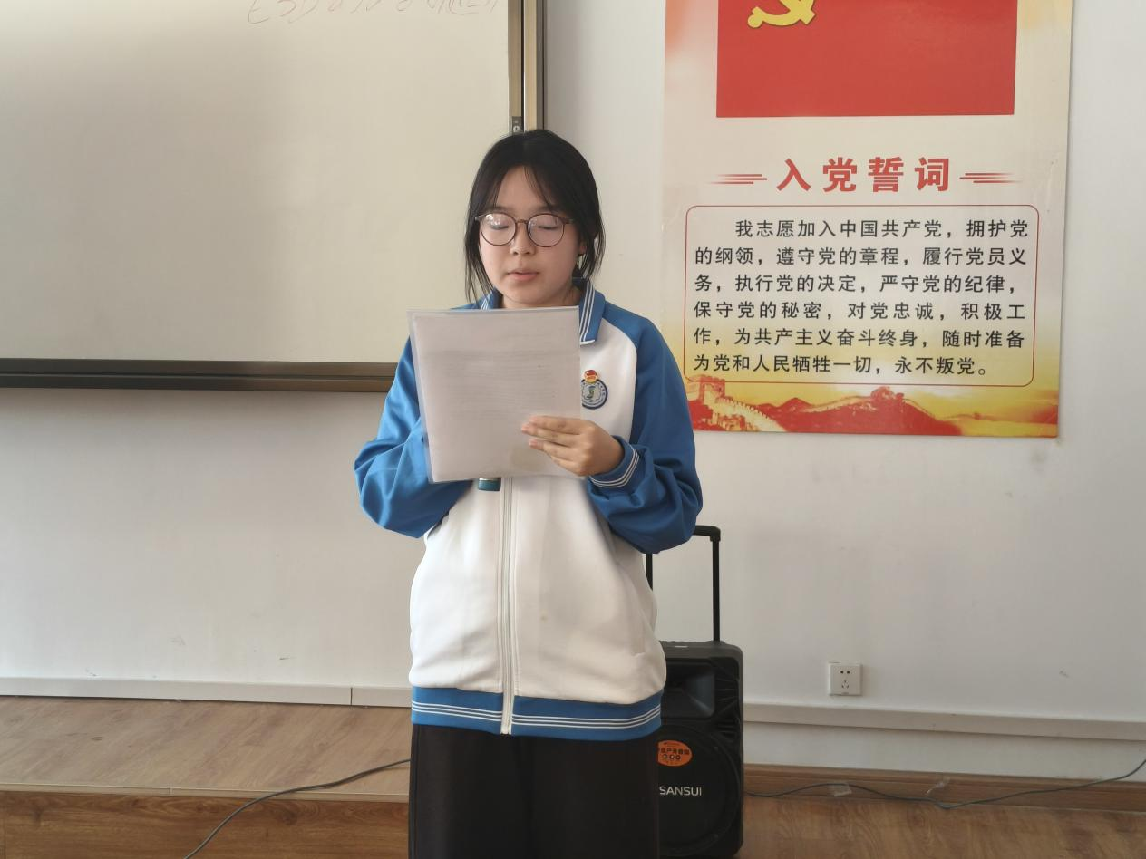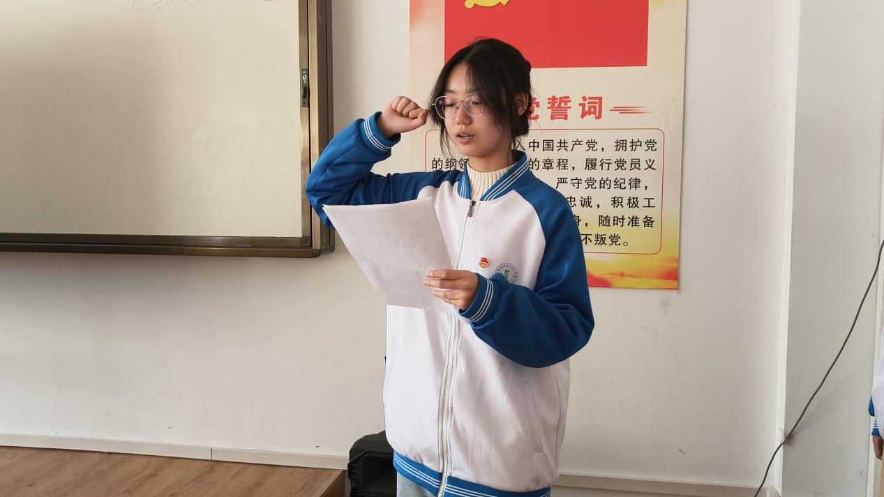 仪式在雄壮的国歌声中拉开序幕。杨涛、李铭萱等老师为新团员发放团徽,新团员互戴团徽,熠熠生辉的团徽佩于胸前,团员脸上写满自豪与荣耀。随后,新团员代表李佳璐上台发言,她结合自身成长经历,分享准备成为共青团员的责任与担当,激励新团员珍惜青春韶华,严于律己,在学习实践中砥砺品格、增长才干。